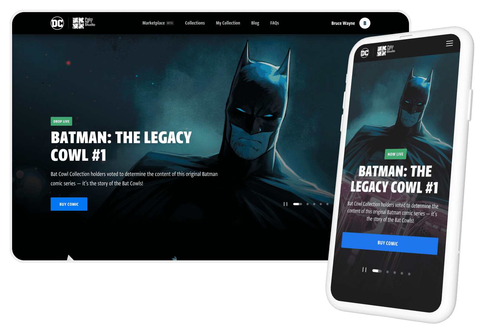 The DC NFT Universe is a platform for DC fans to collect original artwork, buy and trade digital collectibles, and help create original storylines that appear in real comic books. As Senior Product Designer, I worked alongside our Design Lead to own desktop and mobile design, the design system, and all platform features — including the marketplace, collectible comics reader, onboarding, purchase and withdrawal flows, and post-launch feature evolution. The primary challenge: make blockchain technology invisible to brand fans who just wanted to collect Batman art, while keeping the experience credible for crypto-native users. We had roughly four months to ship, timed to the release of The Batman movie.