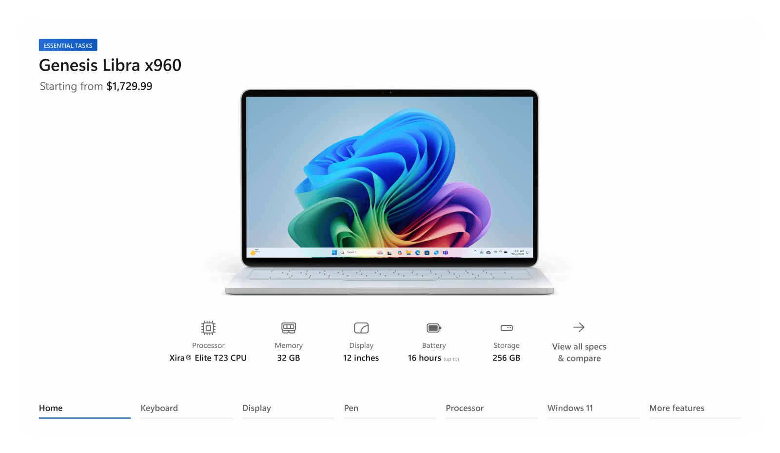 Rather than showing different layouts and content for each device, I designed a unified experience. The home screen shows just enough (device name, collection, price, hero image, and four key specs) with a floating tab bar for deeper exploration into features, specs, and test drives. Hover reveals meaning; click is commitment. Nothing overwhelms.